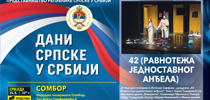 U okviru manifestacije „Dani Srpske u Srbiji“ u Somboru će se 24. septembra, u Narodnom pozorištu Sombor, sa početkom u 20 časova, odigrati predstava „42 (ravnoteža jednostavnog anđela)“ Studia Teatrolog u saradnji sa Narodnim pozorištem Istočno Sarajevo.