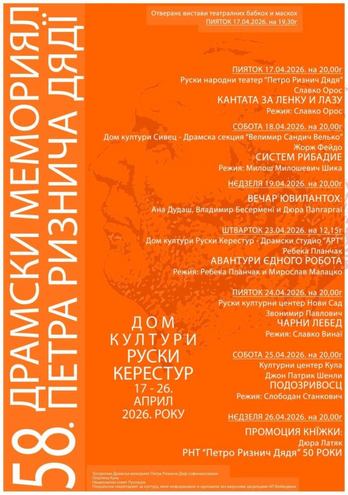 Memorijal će biti završen u nedelju, 26. aprila, promocijom knjige Đure Latjaka, koja beleži pola veka postojanja Rusinskog narodnog pozorišta „Petro Riznič Đađa“.